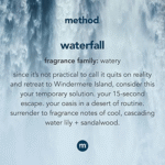 • Waterfall fragrance is an oasis of cool, cascading water lily and soft sandalwood notes.